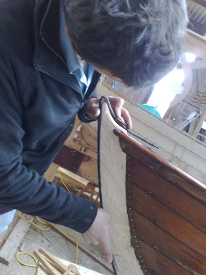 The stem on a skiff like this doesn’t really have any rebate for the ends of the planking, instead the plank ends are bevelled off to meet the stem. This is in common with Norse boatbuilding, the only other boats in the UK that I know share this feature, are the craft built around the Shetlands.